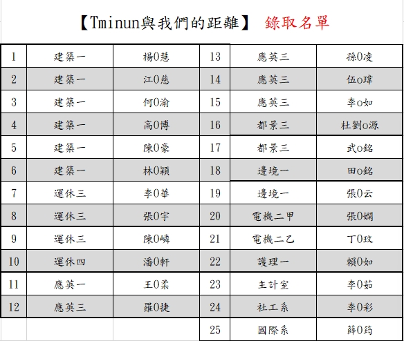【錄取名單】講座課程【Tminun與我們的距離】,講師:廖嘉彣,日期:114/10/20(一),時間:1210-1320、地點:運休教室133。