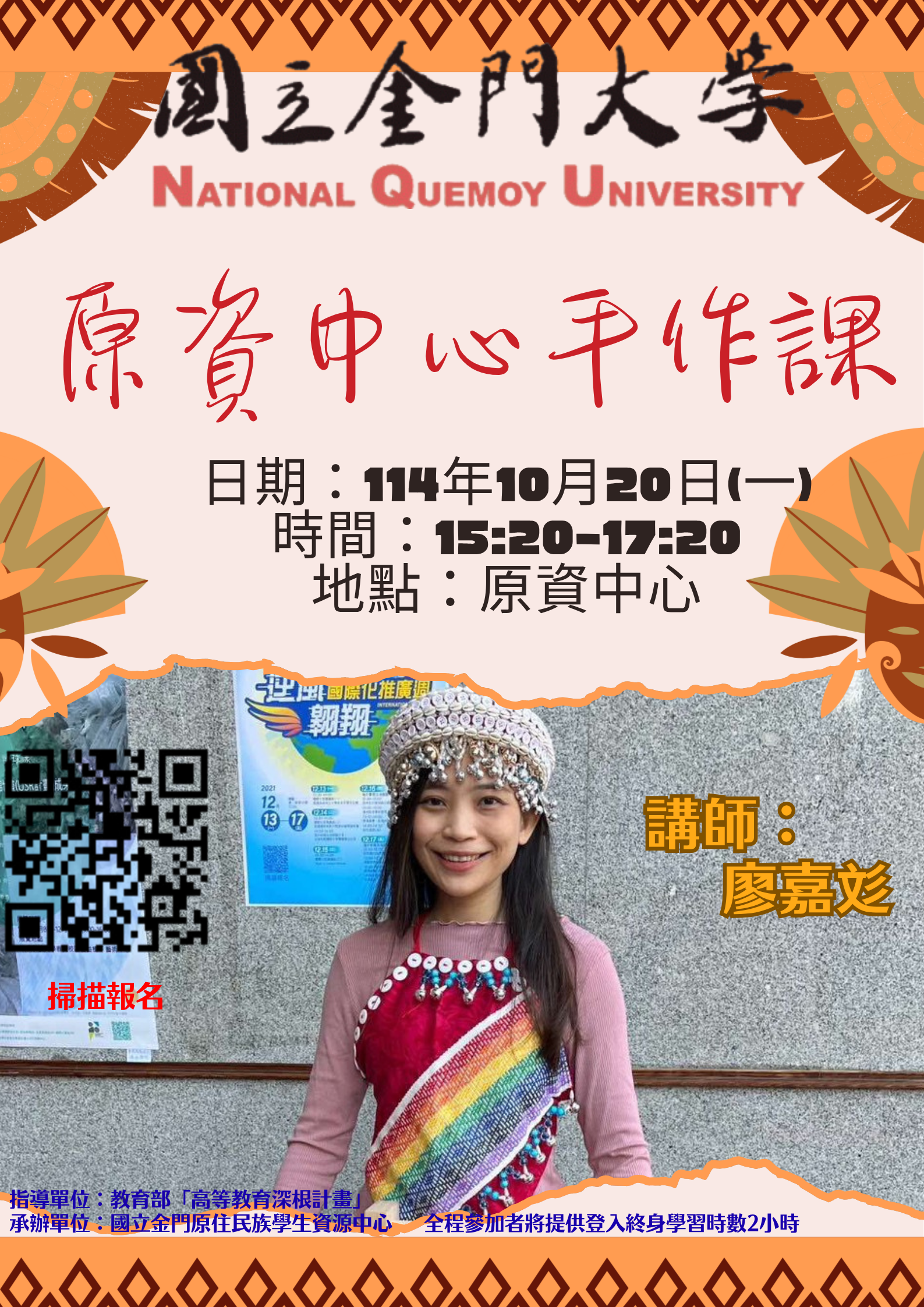 【手作課程】 原資中心手作課程,講師:廖嘉彣老師,日期:114/10/20(一),時間:1530-1730,地點:原資中心B212,歡迎校內師生踴躍參加