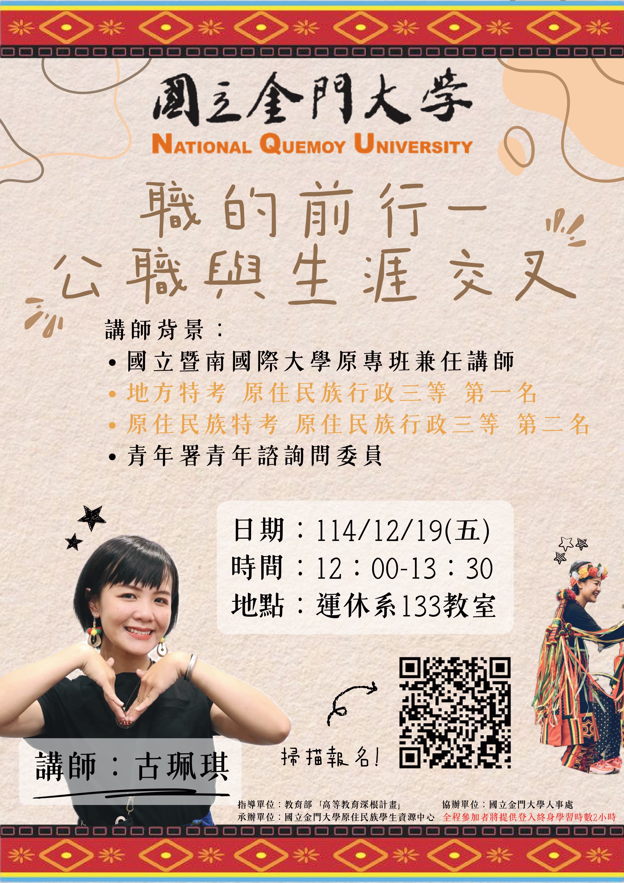 【職涯講座】職的前行—公職與生涯交叉,講師:古珮琪老師,日期:114/12/19(五),時間:1210-1320,地點:運休133教室,歡迎校內師生踴躍參加